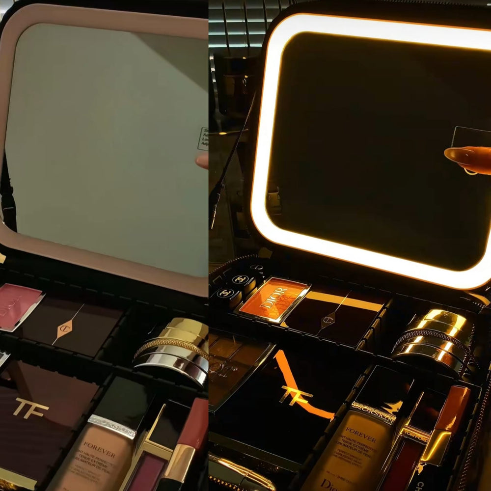 Sí, está fabricada con cuero vegano (PU Premium), resistente a salpicaduras, al uso diario y muy fácil de limpiar. Además, sus divisores internos son firmes, y el espejo con luz LED está protegido para evitar rayones o golpes 😉